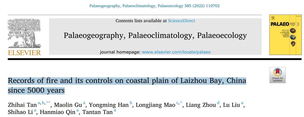 近期,WilliamHill中文官方网站、中科院黄土与第四纪地质国家重点实验室谭志海副教授团队在国际地学领域的Top期刊“Palaeogeography, Palaeoclimatology, Palaeoecology”(《古地理、古气候、古生态》,2022年影响因子:3.565,SCI一区)上发表了题为“Records of fire and its controls on coastal plain of Laizhou Bay, China since 5000 years”(距今5000年以来中国莱州湾沿海平原火历史及其主控因素)的最新研究。