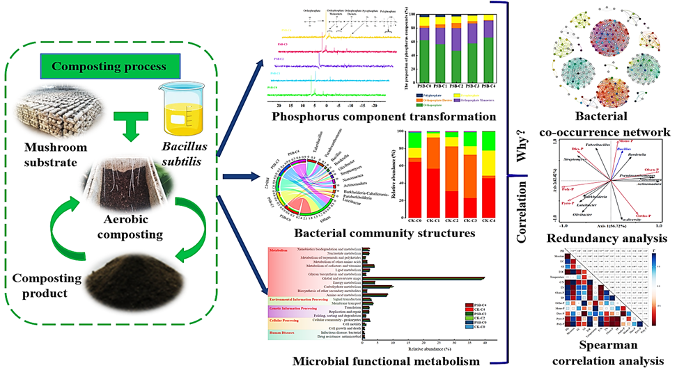 随着人们对饮食质量和绿色食品品种需求的不断提高,中国食用菌年产量达到3930万吨,是世界上食用菌产量最大的国家之一。统计表明,每生产1吨新鲜食用菌,可生产5吨废蘑菇基质(SMS)。如果不及时处理,SMS会积累和腐烂,不仅造成生物质资源的浪费,而且还会产生一系列环境危害。目前,如何提高生物质资源堆肥营养效率研究是热点方向之一。研究通过在菌渣堆肥初始阶段接种具有溶磷功能的枯草芽孢杆菌(Bacillus subtilis SL-44)剂。获得了快速堆肥工艺,采用冗余分析(RDA)、共生网络分析(Co-occurrence network analysis)和群落系统发育研究(PICRUSt 2)等方法,研究了在接种增磷枯草芽孢杆菌(B. subtilis, PSB)的SMS好氧堆肥中磷组分、微生物相互作用和代谢特征的动态变化。与对照组相比,接种B. subtilis可进一步提高堆肥产品的成熟品质。接种PSB增加了堆肥的稳定性、腐殖质化程度和细菌多样性,促进了堆肥过程中磷组分的转化。共现网络分析表明PSB增强了微生物间的相互作用。综上所述,本研究为了解溶磷枯草芽孢杆菌的作用和接种对堆肥中磷组分动员的影响,为更好地调节SMS堆肥产品的营养水平和降低环境风险提供了新的视角。