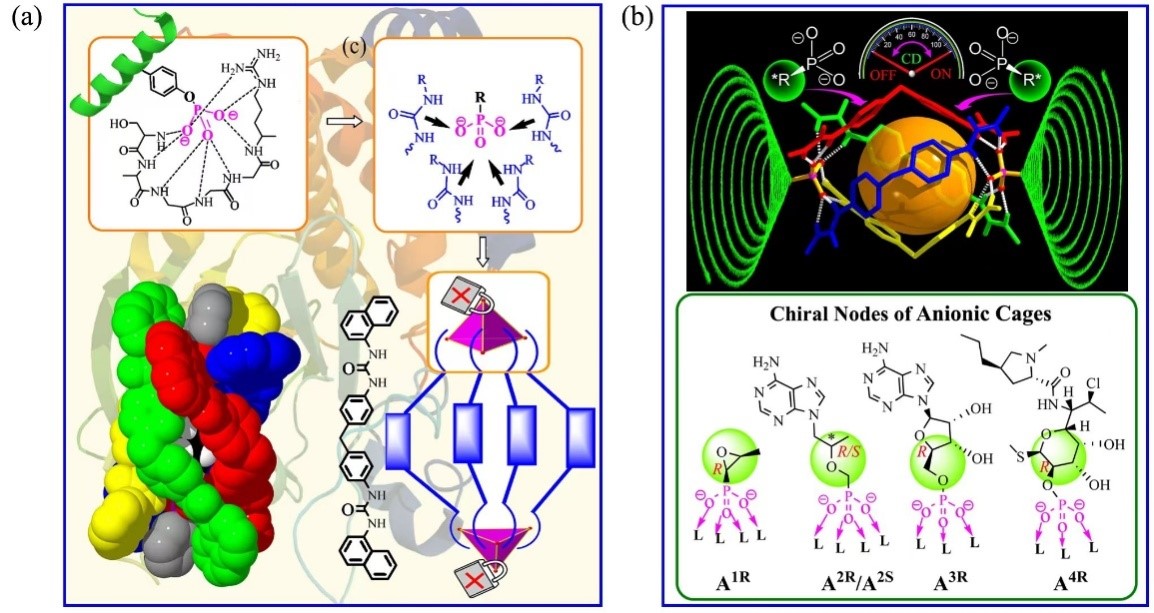 该研究团队通过借鉴磷酸化蛋白的氢键模式,利用有机磷酸盐-单脲配位单元作为新型组装节点,这一策略用更简单的单脲替代邻苯基二脲作为氢键给体,用三配位点的有机磷酸(R-PO32-)替代四配位点的无机磷酸(PO43-)作为氢键受体,成功构筑了荧光型、四螺旋阴离子笼,使阴离子成为一种前所未有的功能化阴离子笼的功能位点,并为阴离子功能化分子笼的构筑提供丰富选择(Angew. Chem. Int. Ed.2022, 61, e202210478)。