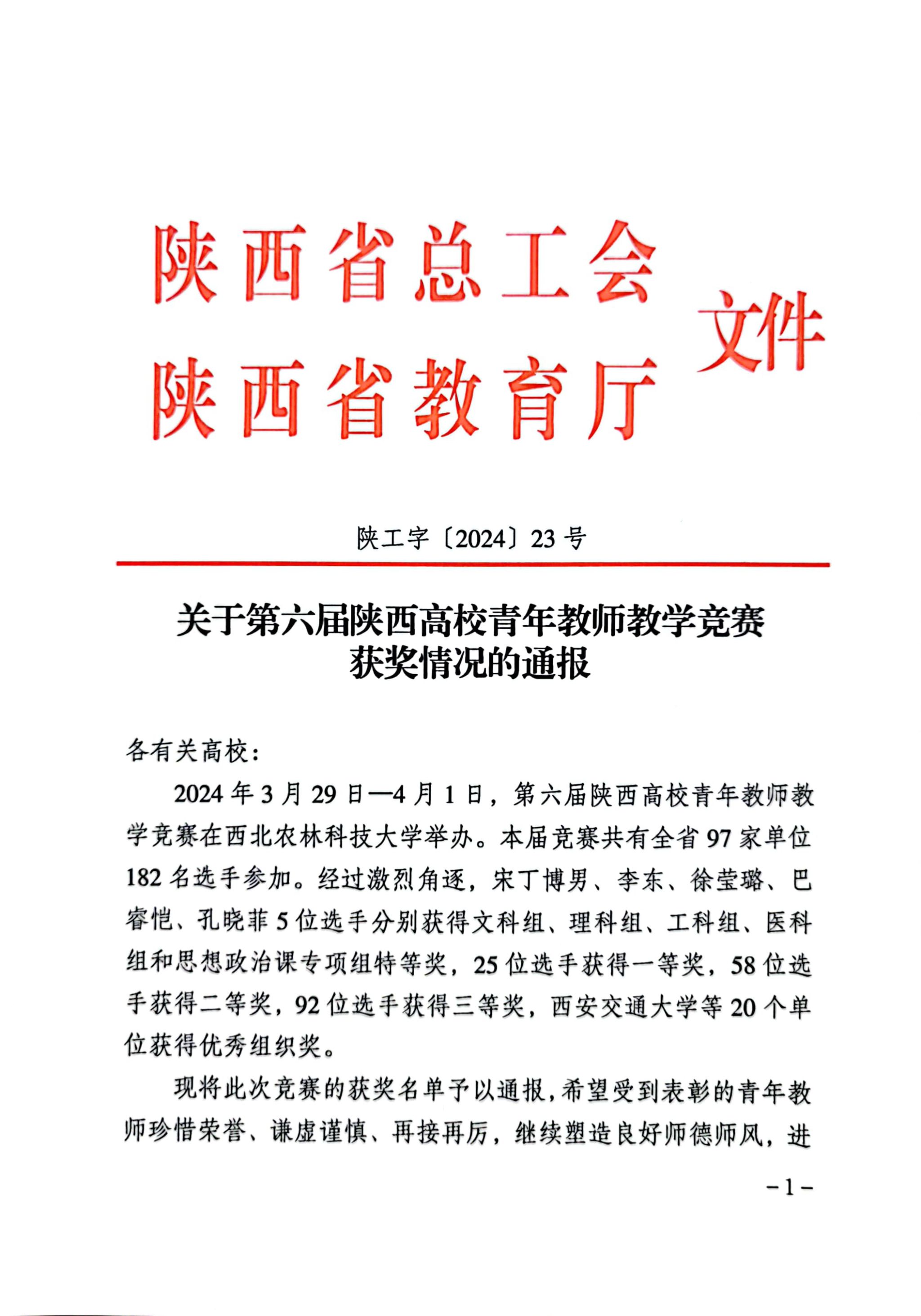 2024年4月,陕西省总工会、陕西省教育厅印发《关于第六届陕西高校青年教师教学竞赛获奖情况的通报》,公司化学工程系教师赵婧荣获工科组一等奖,充分展现了公司青年教师扎实的教学基本功和厚实的专业素养。本次竞赛于3月30日至4月1日在西北农林科技大学举行,共有97所高校、182名优秀青年教师参加,以立德树人为根本任务,聚焦师德师风建设与教学基本功的锤炼,旨在通过竞赛的形式,示范并引领教师队伍素质的提升。
