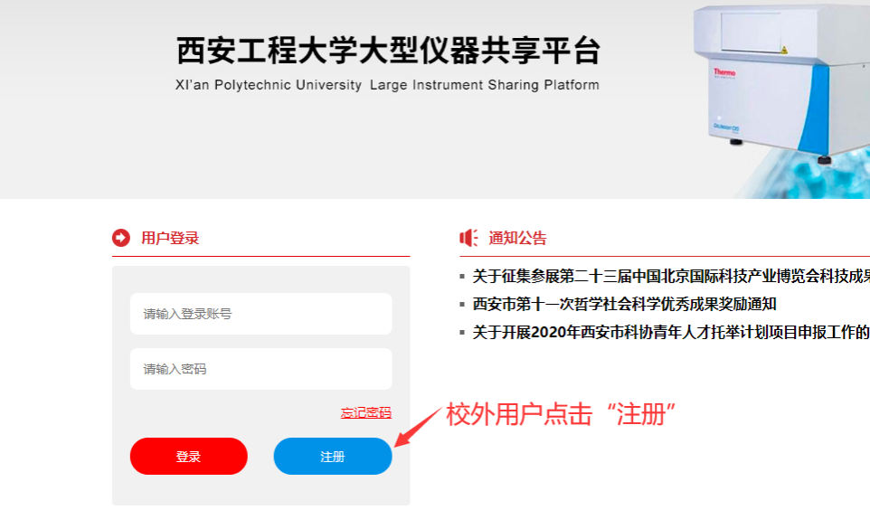 校外用户点击“注册”填写信息注册,待管理人员审核通过后方可进行登录