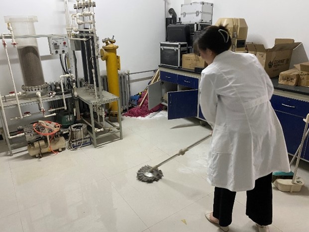 杨巧巧、刘彩琴和李梦瑶3名同学对清理设备后的库房地面和台面进行清理打扫。