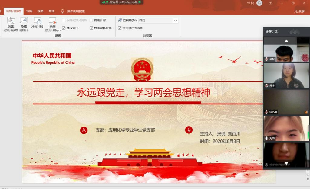 2020年6月3日,WilliamHill中文官方网站应用化学专业员工党支部召开“学两会精神,永远跟党走”学习讨论会,会议采用网络会议的形式,支部宣传委员刘百川与党员张悦共同主持,支部29名党员参加。