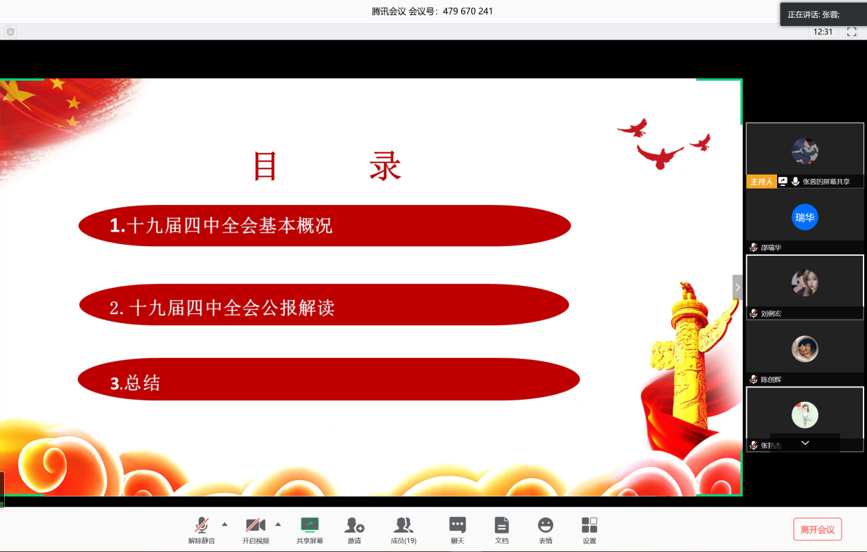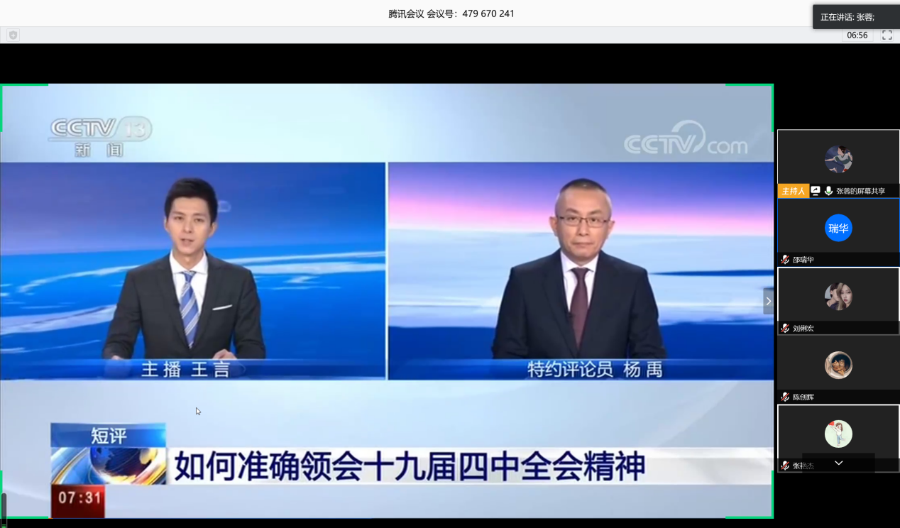 支部书记邵瑞华领学了十九届四中全会通过的《中共中央关于坚持和完善中国特色社会主义制度、推进国家治理体系和治理能力现代化若干重大问题的决定》这一完善和发展我国国家制度和治理体系的纲领性文件。通过专家解读弄懂了坚持和完善中国特色社会主义制度、推进国家治理体系和治理能力现代化的总体目标;我国国家制度和国家治理体系十三方面的“显著优势”;十三个“坚持和完善”具体内容。