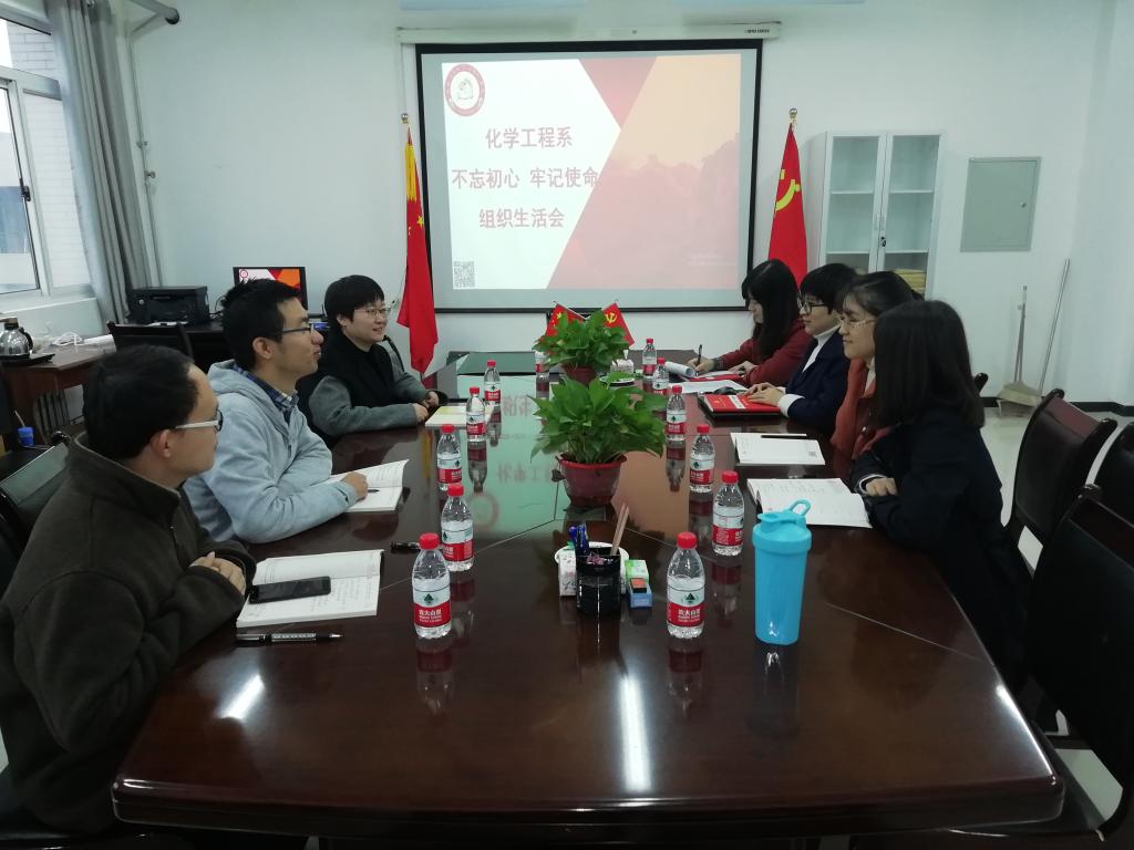 2019年10月24日上午,WilliamHill中文官方网站化工系党支部在WilliamHill中文官方网站506会议室召开了“不忘初心、牢记使命”主题生活会。支部书记杜燕萍同志根据党中央的要求,向青年教师党员们强调了立德树人的重要性,督促大家进一步学习习近平关于对高校教师的党建要求。并进一步深入讨论了“双创”支部的建设要求,对照职责进行了详细分工,党员们表示会以饱满的热情积极参与“双创”支部的建设。