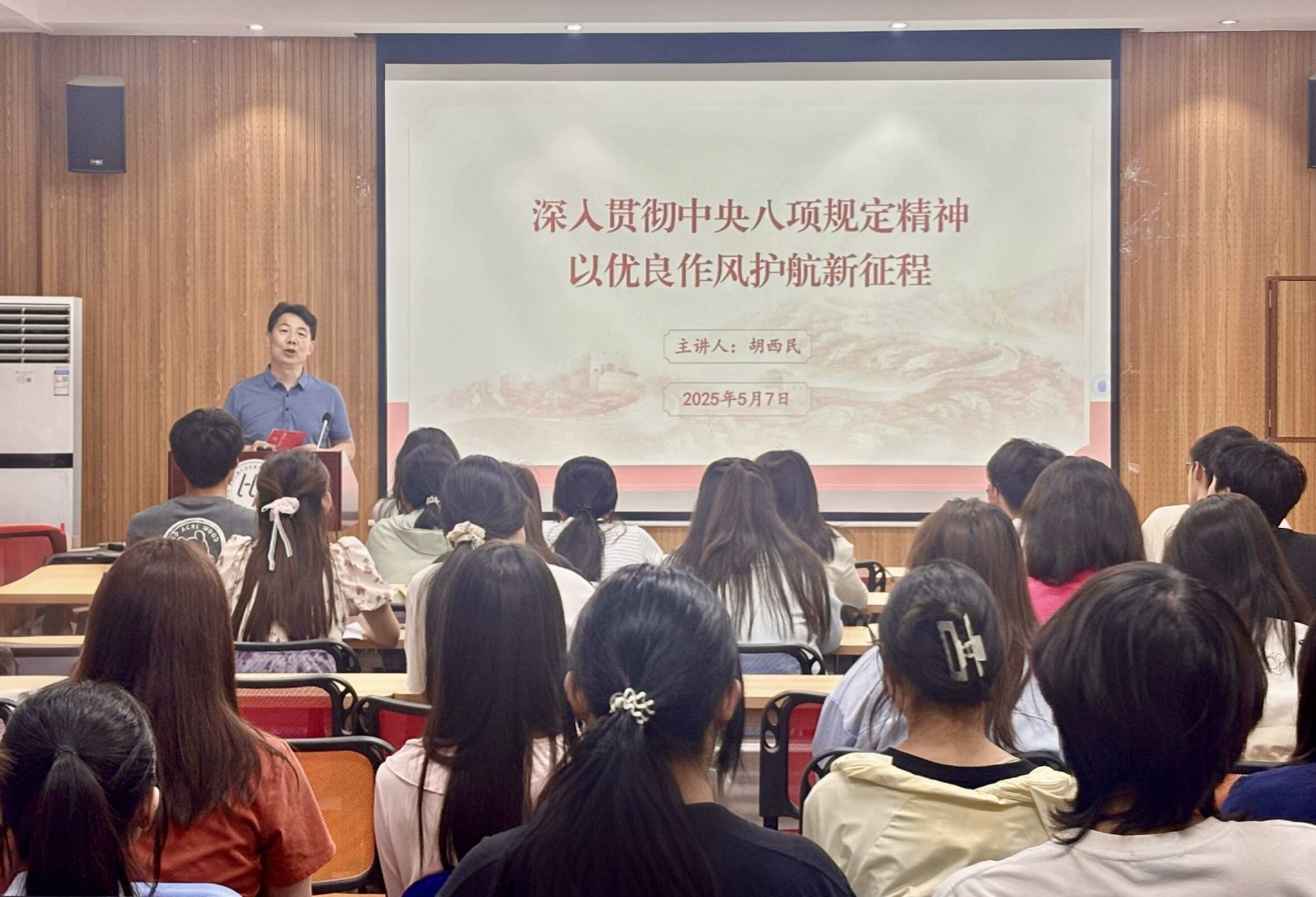 课堂上,胡西民书记以历史纵深视角,通过详实的数据和典型案例剖析,再现中央八项规定出台的时代背景与发展脉络,阐释“一个规定改变中国”的深刻变革。“作风建设不是选择题而是必答题,既要铭刻在成长坐标上,更要落实到成才实践中。”胡西民结合公司发展建设实际,向青年学子提出三维成长指南:在思想维度建立“警戒线”,将纪律要求转化为价值认同;在行为维度架设“探照灯”,让自我约束成为行动自觉;在发展维度铺设“快车道”,以清正作风赋能学业进步。