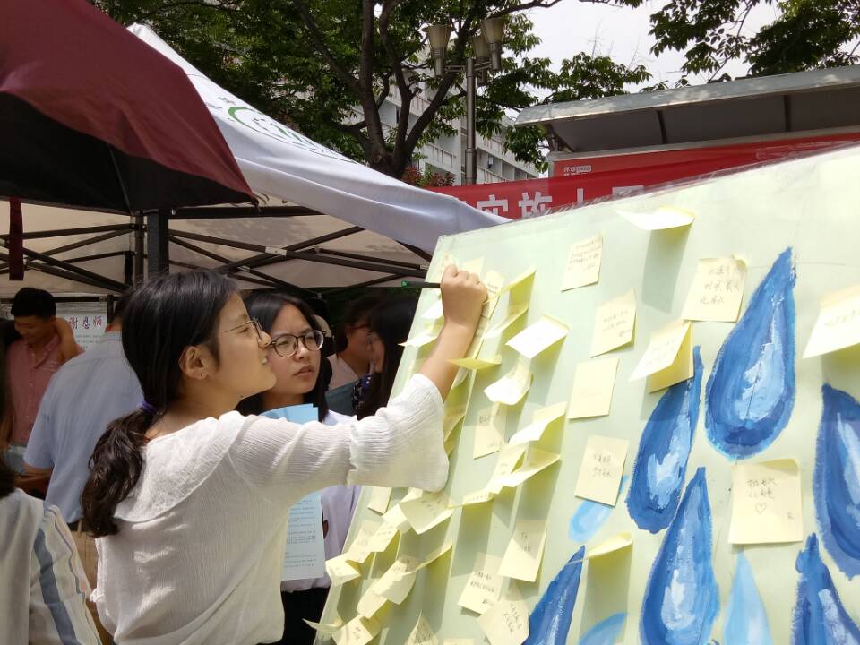 5月19号当天上午,在活动现场,广场节水宣传活动共分为五个板块:在图片展示区通过展板详细的给老员工展示了水在人们生活生产可持续发展中的重要性;在知识问答区员工们通过知识问答知晓了节约用水原来有很多的方法,并且自己就可以立即去做,同时对参加回答问题的员工有小纪念品;在寄语墙,同学们写下了对节约用水的决心和期望活动现场还有由“绿风”环保协会创作的节水诗歌,由主持人在广场朗诵,希望能呼吁更多的员工参加进来,来到活动现场的不少员工还在横幅上签下自己的名字,让节水理念通过更多的人传播出去。