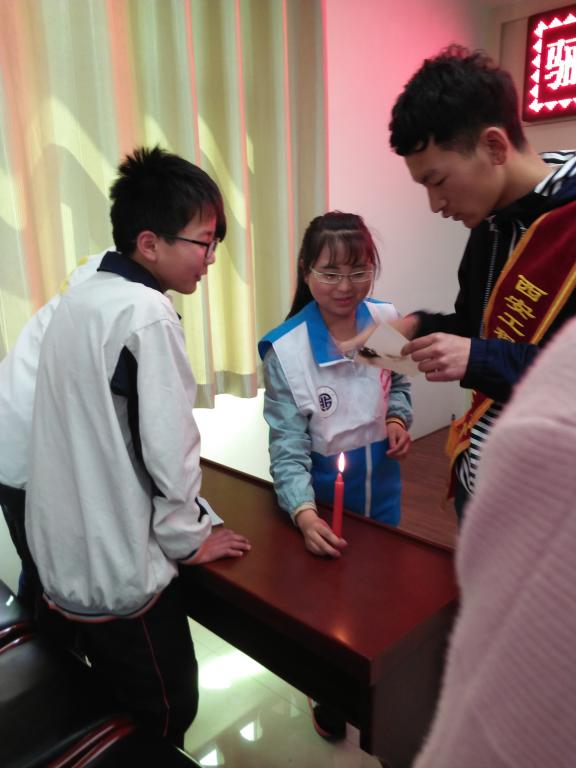 活动开始,志愿者们为同学们分发了切好的土豆,和沾有碘液的棉签,以碘液遇土豆中淀粉变蓝色这样一个生活中关于化学的小实验,为同学们揭开化学一层神秘的面纱。正式进入此次活动的主题后,由一名志愿者以ppt为同学们形象的介绍了生活中的化学,通过播放“面包的制作”以及“五彩缤纷的烟花”视频,引起了同学们对化学兴趣。之后,志愿者们为同学们演示了:“卫生球在白醋与小苏打的混合溶液中上下跳动”,“柠檬汁在白纸上写字,用蜡烛熏过后会出现字迹”的“密信”趣味化学实验,使活动更加有意义。