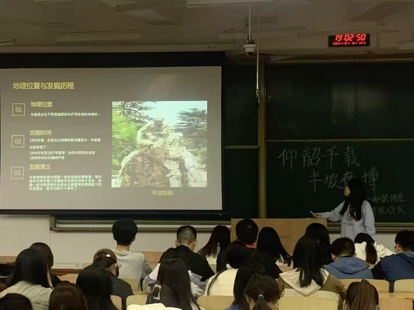 在此次活动中,还开展了“击鼓传花”游戏,与同学进行PPT互动问答,对积极参与问答的同学送上礼品,半坡讲解者下台之后,由半坡成员对本次活动进行总结。最后,我们邀请同学们参加了半坡博物馆的讲解志愿者活动,对想了解相关事宜的同学们进行详细的解答。活动结束后,半坡义导队成员会对场地进行打扫。