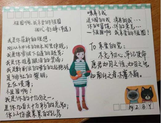 活动中,同学们发挥自己的长处,踊跃参加活动,创造了不同风格的作品,有古风、卡通、诗文等,同学们的作品体现出了他们的感恩之情。"亲爱的祖国愿您如月之永恒,如日之升";"我是你崭新的理想,我是你雪被下古莲的胚芽";"祖国啊,我是你的十亿分之一,是你九万六十万平方的总和。"......