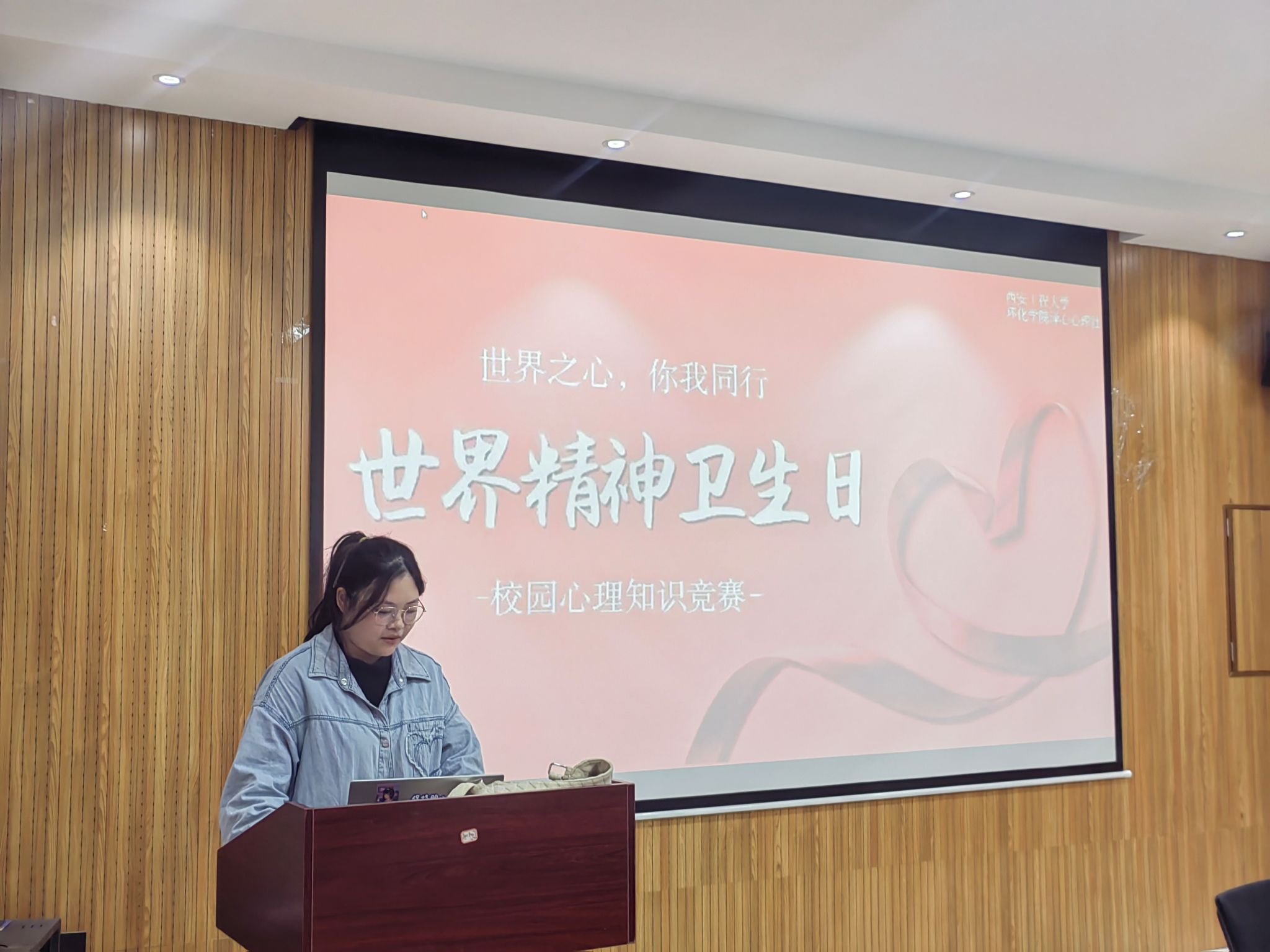 2023年10月8日至15日,为了向全校师生宣传精神卫生的重要性,普及心理健康知识,提高同学们的心理健康意识,引导广大同学关注精神卫生,保持心理健康和身体健康协调统一。故由校团委社团管理中心主办,译心心理社承办“世界之心,你我同行”活动。本次活动采用线下形式,面向WilliamHill全体员工进行知识竞赛。社长高乐洋及译心心理社社员参与主持活动。