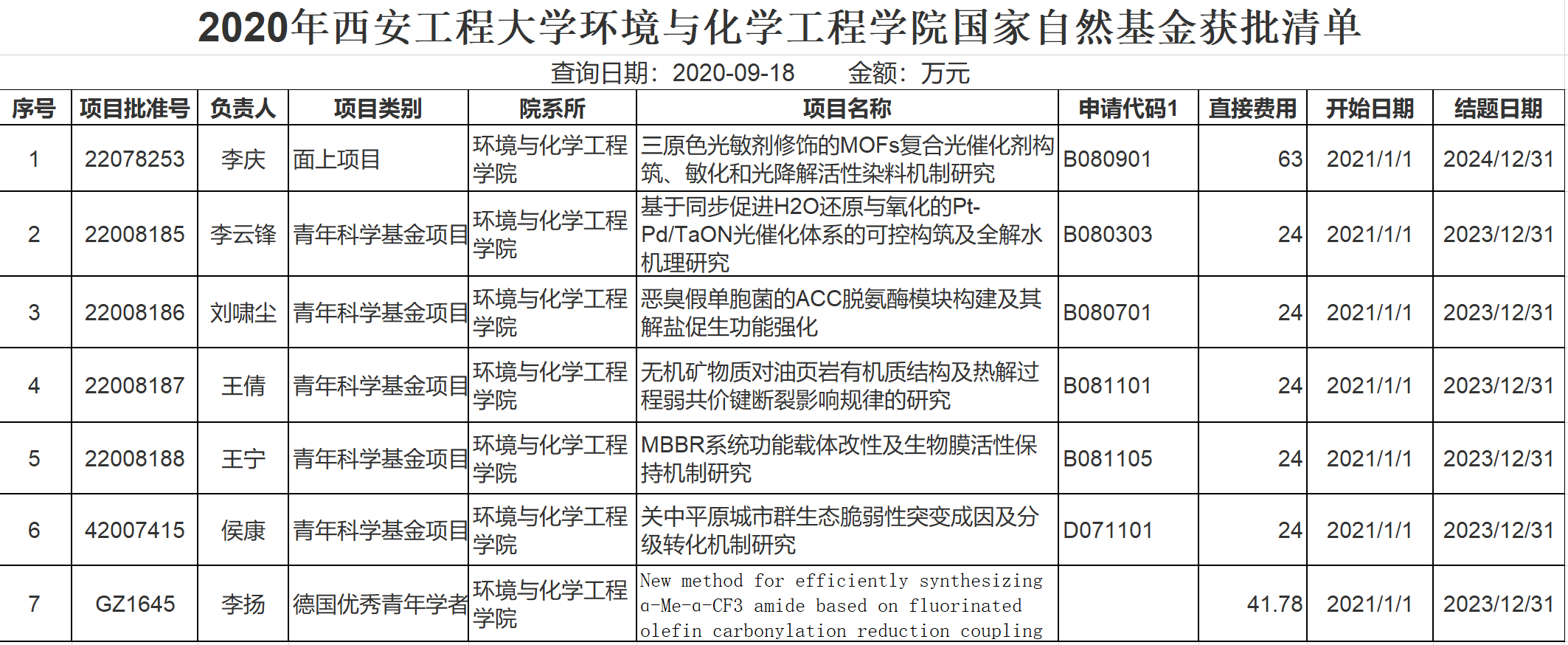 近日,国家自然科学基金委公布了2020年国家自然科学基金立项名单,公司共有7项研究项目立项,研究经费共计224.78万元,实现了历史突破。