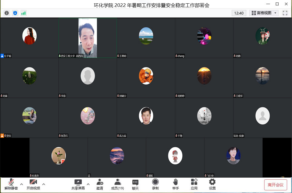 7月14日公司稳定安全工作会结束后,公司立即通过腾讯会议召开2022年暑期工作安排暨安全稳定工作线上部署会。公司党委书记胡西民、经理张洛红和党政班子全体成员,党委委员、工会主席,实验中心负责人,以及各系主任、各党支部书记、全体辅导员参加会议,会议由党委书记胡西民主持。