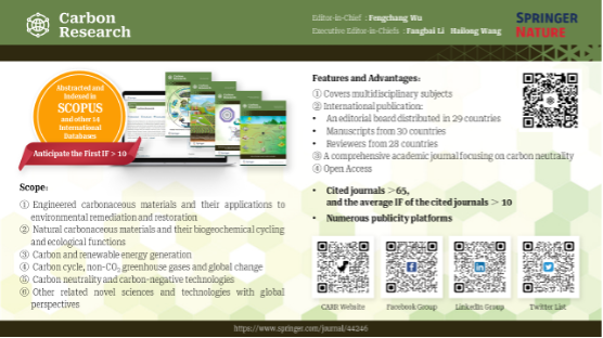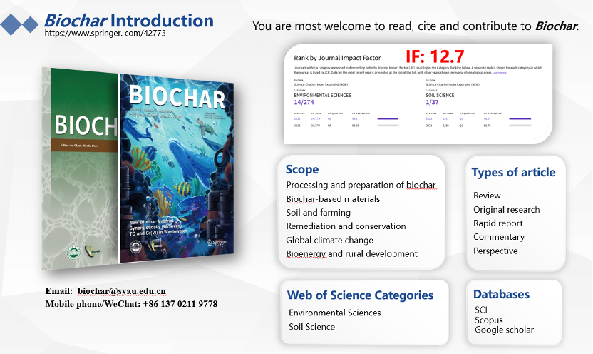 《Biochar》是《Carbon Research》姊妹期刊,是由沈阳农业大学主理并与施普林格·天然团体协作出书的全英文季刊,于2019年3月创刊,是环球第一本生物炭范畴期刊。目前是中国科公司期刊分区一区,影响因子12.7。《Carbon Research》是由广东省科公司生态环境与土壤研究所主办的国际全英文季刊,于2022年6月18日创刊正式登陆Springer Nature集团在线平台,于2022年3月17号正式开放投审稿系统,目前以开放获取模式出版。武占省教授是这两个期刊青年编委,欢迎广大师生投稿、检索阅读。