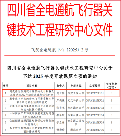 喜讯!公司赵亚梅教授牵头申报的开放基金项目《陶瓷基光热超疏水涂层的设计制备及其被动防冰/主动除冰过程强化研究》成功获批四川省全电通航飞行器关键技术工程研究中心开放课题立项。这是公司首次获批该中心开放课题,也是公司在有组织科研和学术生态建设方面取得的重要进展。