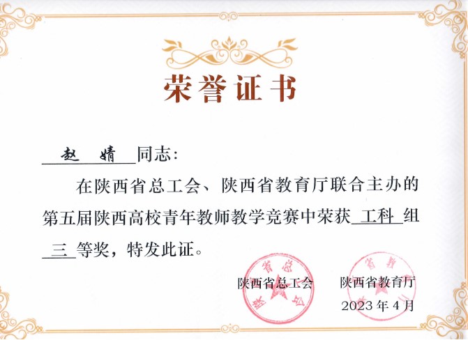 为了加强青年教师教学基本功和能力训练,充分发挥其在提高教师队伍素质中的示范引领作用,由陕西省总工会、陕西省教育厅举办的第五届陕西高校青年教师教学竞赛于2023年3月14日至15日在陕西师范大学进行,本次竞赛以“上好一门课”为理念,分为教学设计、课堂教学和教学反思三个环节,来自陕西省47所高校的115名青年教师参加了此次竟赛。经过激烈角逐,公司化学工程系青年教师赵婧获得工科组三等奖。