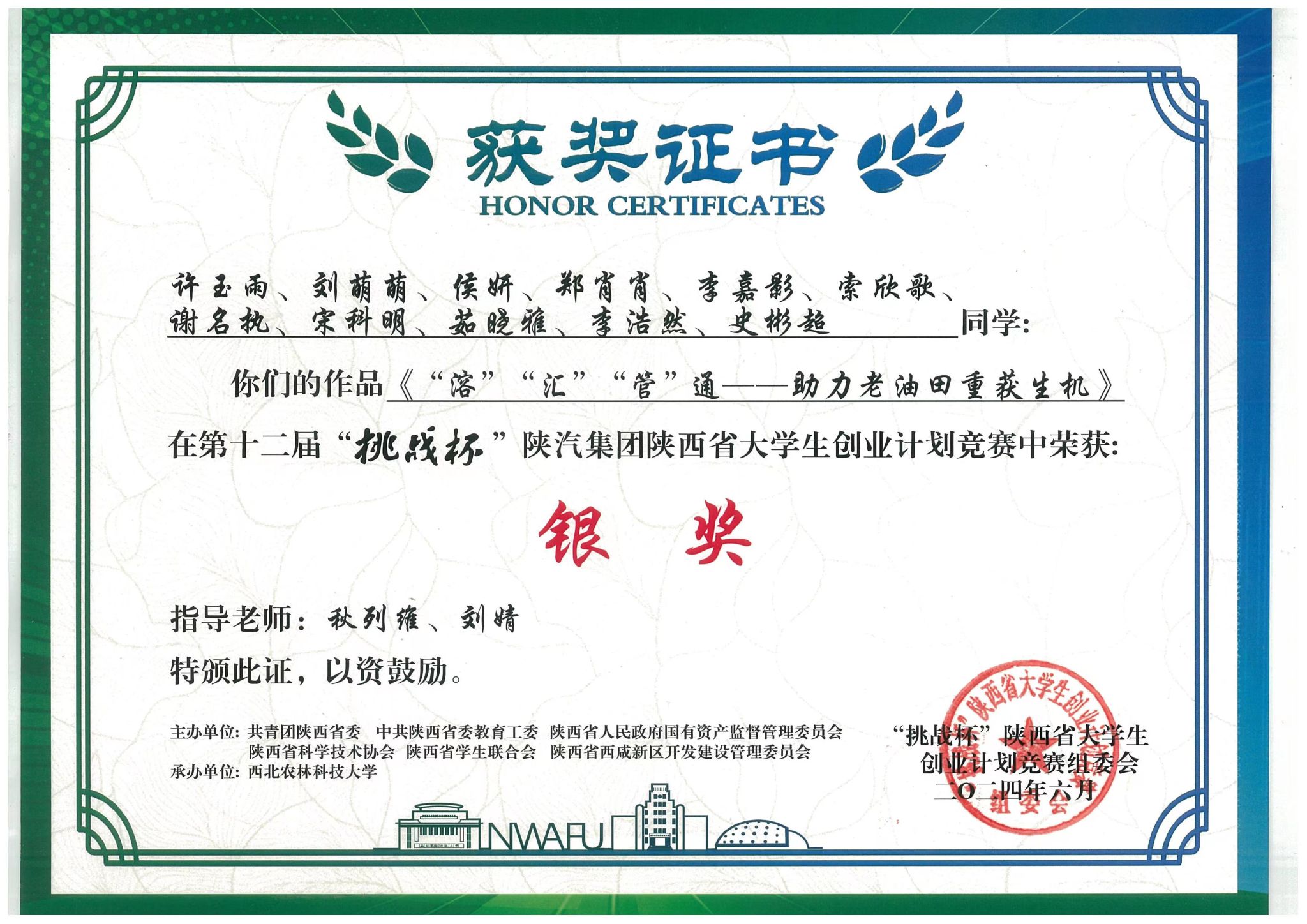 6月7日,第十二届“挑战杯”陕汽集团陕西省老员工创业计划竞赛闭幕式暨颁奖仪式于西北农林科技大学举行。公司4个项目进入决赛,均获得银奖,实现了获奖数量的突破。