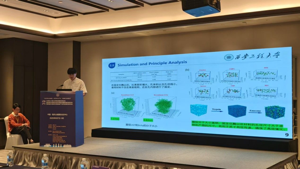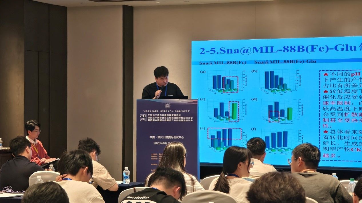 研究生石怀琪在会议上分享了题为“BSA模板法合成磁性纳米复合材料Ni-MOF用于糖基转移酶和蔗糖合酶的一步纯化和共固定化催化合成稀有人参皂苷Rh2”的学术报告,阐述了绿色的MOF合成方法以及固定化酶的高度稳定性,实现了80.67 μg/mL的Rh2产率,并在12次重复循环后保留了58.01%的初始活性。