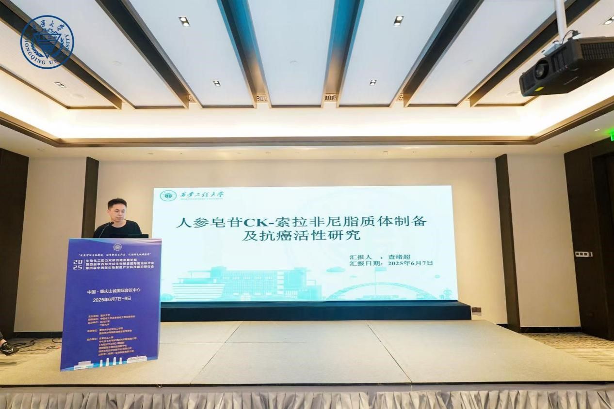 研究生刘雨婷在会议上分享了“高载人参皂苷CK羧甲基壳聚糖纳米粒子的制备及其抗肝癌活性研究”的学术报告,阐述了该纳米粒子使HepG2细胞存活率从58.63%降至46.04%(48 h),其抑癌效果显著增强。
